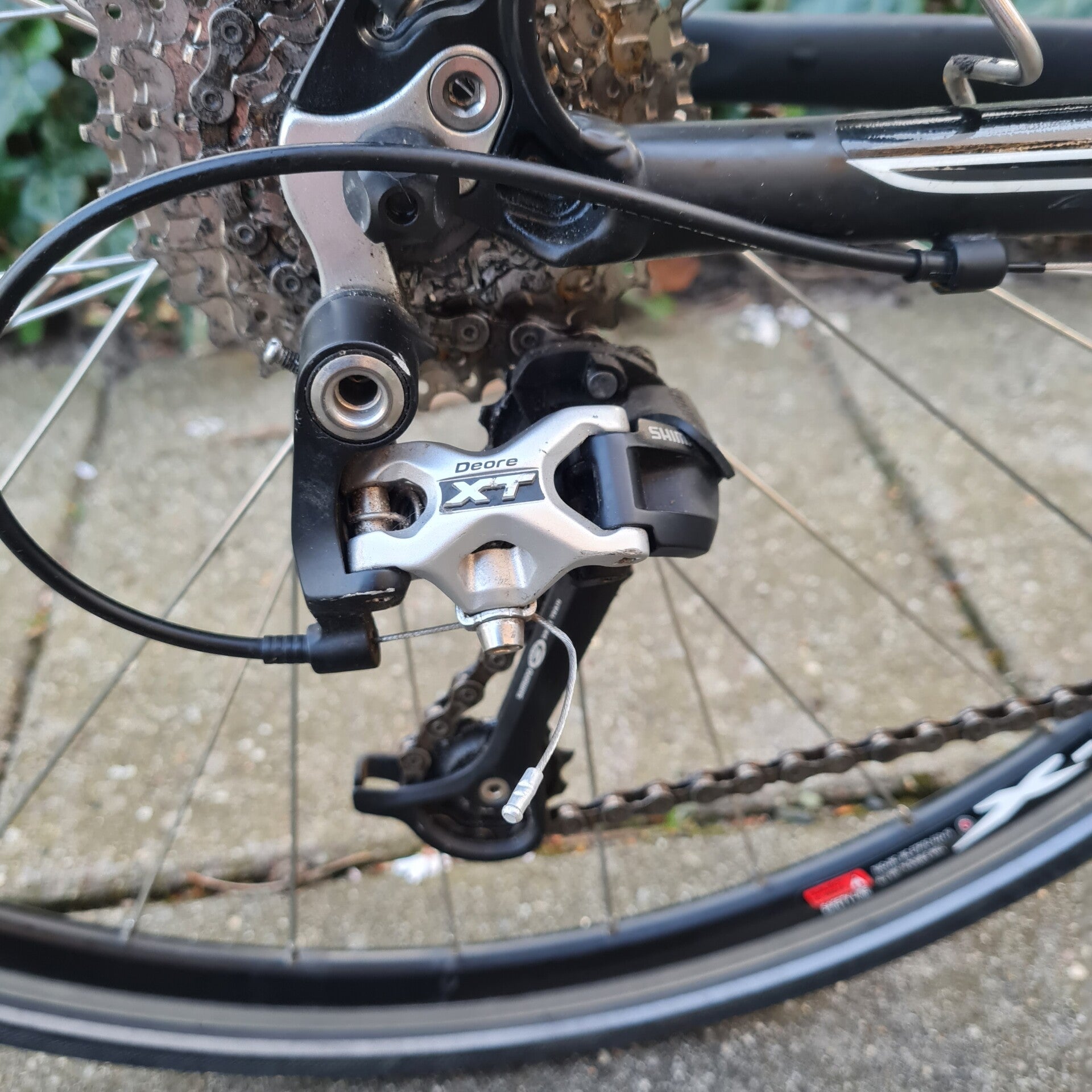 Achter derailleur van Shimano Deore XT.